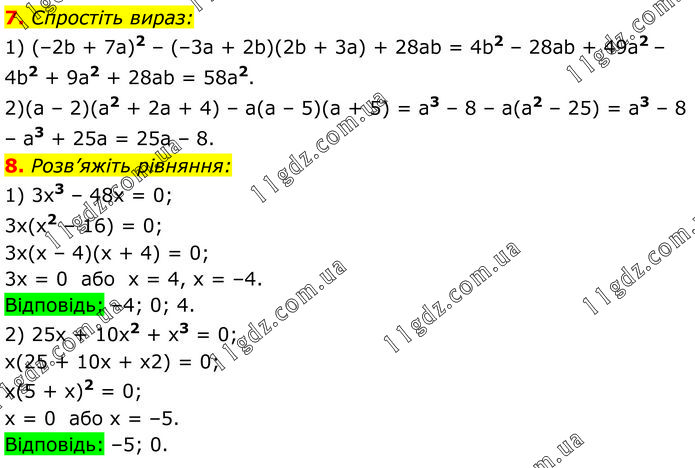 7. Спростіть вираз: 1) (–2b + 7a)2 – (–3a + 2b)(2b + 3a) + 28ab = 4b2 – 28ab + 49a2 – 4b2 + 9a2 + 28ab = 58a2. 2)(a – 2)(a2 + 2a + 4) – a(a – 5)(a + 5) = a3 – 8 – a(a2 – 25) = a3 – 8 – a3 + 25a = 25a – 8. 8. Розв’яжіть рівняння: 1) 3x3 – 48x = 0; 3x(x2 – 16) = 0; 3x(x – 4)(x + 4) = 0; 3x = 0 або х = 4, х = –4. Відповідь: –4; 0; 4. 2) 25x + 10x2 + x3 = 0; x(25 + 10x + x2) = 0; x(5 + x)2 = 0; x = 0 або х = –5. Відповідь: –5; 0.