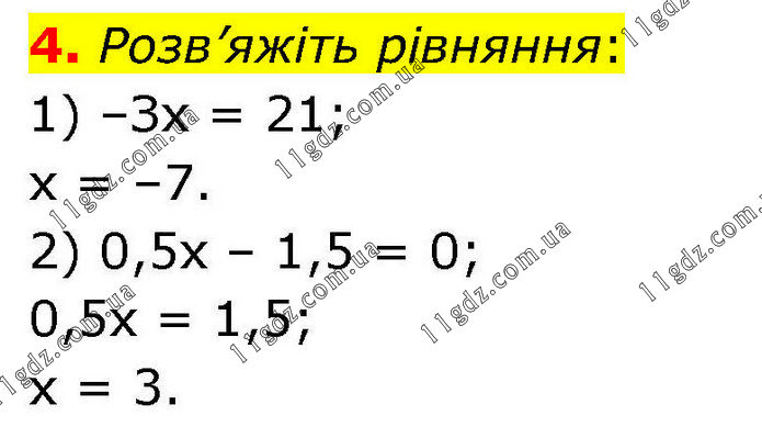 4. Розв’яжіть рівняння: 1) –Зх = 21; х = –7. 2) 0,5х – 1,5 = 0; 0,5х = 1,5; х = 3.