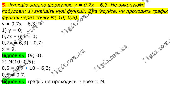 Функцію задано формулою у = 0,7х – 6,3. Не виконуючи побудови: 1) знайдіть нулі функції; 2) з ’ясуйте, чи проходить графік функції через точку М( 10; 0,5). y = 0,7x – 6,3; 1) y = 0; 0,7x – 6,3 = 0; 0,7x = 6,3| : 0,7; x = 9. Відповідь: (9; 0). 2) M(10; 0,5); 0,5 = 0,7 • 10 – 6,3; 0,5 ≠ 0,7. Відповідь: графік не проходить через т. М.