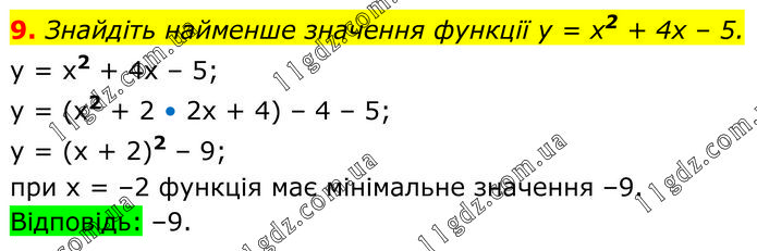 Знайдіть найменше значення функції у = х2 + 4х – 5. y = x2 + 4x – 5; y = (x2 + 2 • 2x + 4) – 4 – 5; y = (x + 2)2 – 9; при х = –2 функція має мінімальне значення –9. Відповідь: –9.