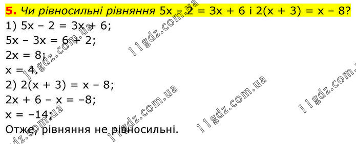 5. Чи рівносильні рівняння 5х – 2 = Зх + 6 і 2(х + 3) = х – 8? 1) 5х – 2 = 3х + 6; 5х – 3х = 6 + 2; 2х = 8; х = 4. 2) 2(х + 3) = х – 8; 2х + 6 – х = –8; х = –14; Отже, рівняння не рівносильні.