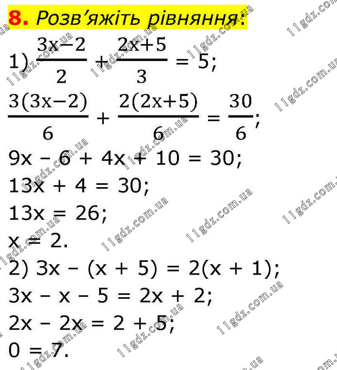 Розв’яжіть рівняння: 1) (3х-2)/2 + (2х+5)/3 = 5; (3(3х-2))/6 + (2(2х+5))/6 = 30/6; 9х – 6 + 4х + 10 = 30; 13х + 4 = 30; 13х = 26; х = 2. 2) Зх – (х + 5) = 2(х + 1); 3х – х – 5 = 2х + 2; 2х – 2х = 2 + 5; 0 = 7.
