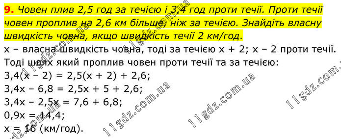 Човен плив 2,5 год за течією і 3,4 год проти течії. Проти течії човен проплив на 2,6 км більше, ніж за течією. Знайдіть власну швидкість човна, якщо швидкість течії 2 км/год. х – власна швидкість човна, тоді за течією х + 2; х – 2 проти течії. Тоді шлях який проплив човен проти течії та за течією: 3,4(х – 2) = 2,5(х + 2) + 2,6; 3,4х – 6,8 = 2,5х + 5 + 2,6; 3,4х – 2,5х = 7,6 + 6,8; 0,9х = 14,4; х = 16 (км/год).