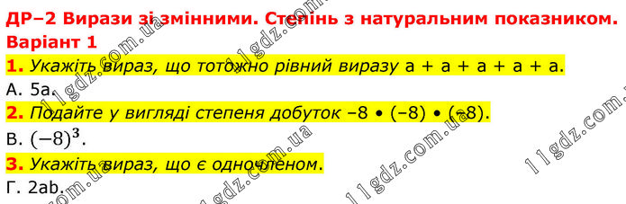 ДР–2 Вирази зі змінними. Степінь з натуральним показником. Варіант 1 1. Укажіть вираз, що тотожно рівний виразу а + а + а + а + а. А. 5а. 2. Подайте у вигляді степеня добуток –8 • (–8) • (–8). В. 〖(-8)〗^3. 3. Укажіть вираз, що є одночленом. Г. 2ab.