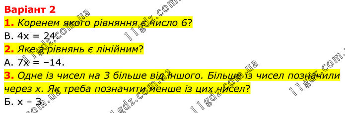 Варіант 2 1. Коренем якого рівняння є число 6? B. 4х = 24. 2. Яке з рівнянь є лінійним? A. 7x = –14. 3. Одне із чисел на 3 більше від іншого. Більше із чисел позначили через х. Як треба позначити менше із цих чисел? Б. х – З.