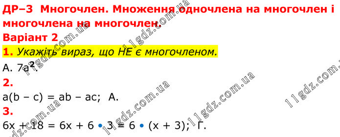 ДР–3 Многочлен. Множення одночлена на многочлен і многочлена на многочлен. Варіант 2 1. Укажіть вираз, що НЕ є многочленом. A. 7a2. 2. a(b – c) = ab – ac; A. 3. 6x + 18 = 6x + 6 • 3 = 6 • (x + 3); Г.