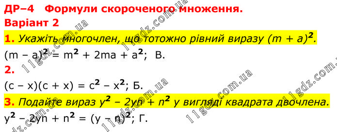 ДР–4 Формули скороченого множення. Варіант 2 1. Укажіть многочлен, що тотожно рівний виразу (m + а)2. (m – a)2 = m2 + 2ma + a2; B. 2. (c – x)(c + x) = c2 – x2; Б. 3. Подайте вираз у2 – 2уn + n2 у вигляді квадрата двочлена. y2 – 2yn + n2 = (y – n)2; Г.