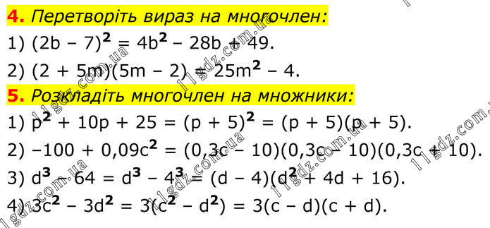4. Перетворіть вираз на многочлен: 1) (2b – 7)2 = 4b2 – 28b + 49. 2) (2 + 5m)(5m – 2) = 25m2 – 4. 5. Розкладіть многочлен на множники: 1) p2 + 10p + 25 = (p + 5)2 = (p + 5)(p + 5). 2) –100 + 0,09c2 = (0,3c – 10)(0,3c – 10)(0,3c + 10). 3) d3 – 64 = d3 – 43 = (d – 4)(d2 + 4d + 16). 4) 3c2 – 3d2 = 3(c2 – d2) = 3(c – d)(c + d).