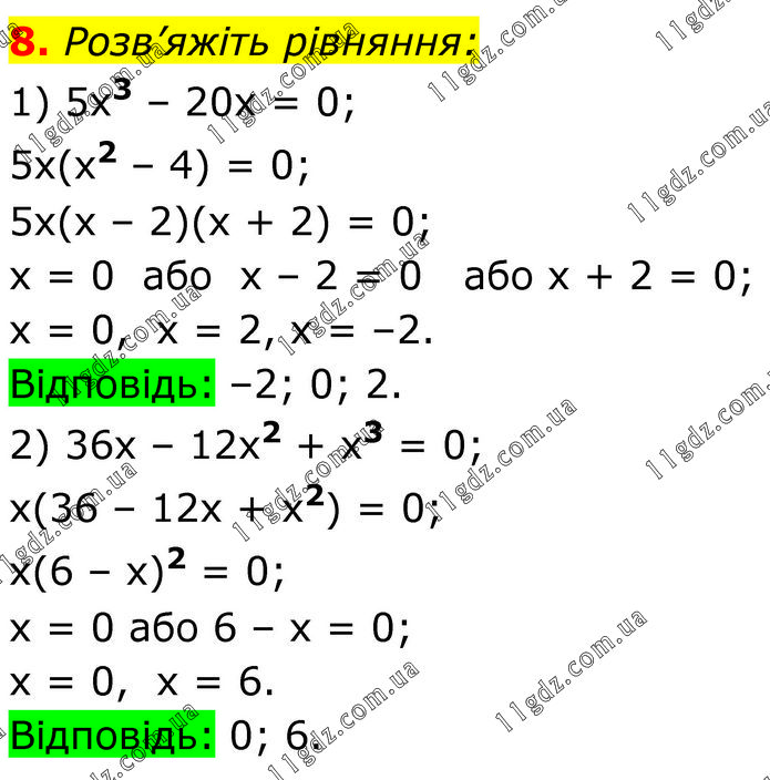 Розв’яжіть рівняння: 1) 5x3 – 20x = 0; 5x(x2 – 4) = 0; 5x(x – 2)(x + 2) = 0; x = 0 або х – 2 = 0 або х + 2 = 0; x = 0, x = 2, x = –2. Відповідь: –2; 0; 2. 2) 36x – 12x2 + x3 = 0; x(36 – 12x + x2) = 0; x(6 – x)2 = 0; x = 0 або 6 – x = 0; x = 0, x = 6. Відповідь: 0; 6.