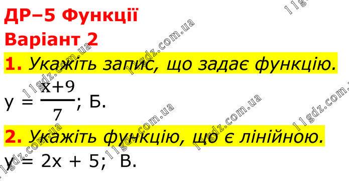 ДР–5 Функції Варіант 2 1. Укажіть запис, що задає функцію. y = (x+9)/7; Б. 2. Укажіть функцію, що є лінійною. y = 2x + 5; В.