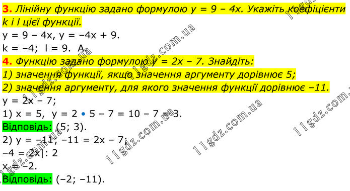 3. Лінійну функцію задано формулою у = 9 – 4х. Укажіть коефіцієнти k і l цієї функції. y = 9 – 4x, y = –4x + 9. k = –4; l = 9. А. 4. Функцію задано формулою у = 2х – 7. Знайдіть: 1) значення функції, якщо значення аргументу дорівнює 5; 2) значення аргументу, для якого значення функції дорівнює –11. y = 2x – 7; 1) x = 5, y = 2 • 5 – 7 = 10 – 7 = 3. Відповідь: (5; 3). 2) y = –11; –11 = 2x – 7; –4 = 2x|: 2 x = –2. Відповідь: (–2; –11).