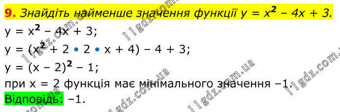 Знайдіть найменше значення функції у = х2 – 4х + 3. y = x2 – 4x + 3; y = (x2 + 2 • 2 • x + 4) – 4 + 3; y = (x – 2)2 – 1; при х = 2 функція має мінімального значення –1. Відповідь: –1.