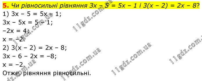 5. Чи рівносильні рівняння Зх – 5 = 5х – 1 і 3(х – 2) = 2х – 8? 1) 3х – 5 = 5х – 1; 3х – 5х = 5 – 1; –2х = 4; х = –2. 2) 3(х – 2) = 2х – 8; 3х – 6 – 2х = –8; х = –2. Отже, рівняння рівносильні.