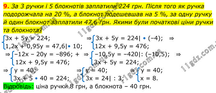 За 3 ручки і 5 блокнотів заплатили 224 грн. Після того як ручка подорожчала на 20 %, а блокнот подешевшав на 5 %, за одну ручку й один блокнот заплатили 47,6 грн. Якими були початкові ціни ручки та блокнота?