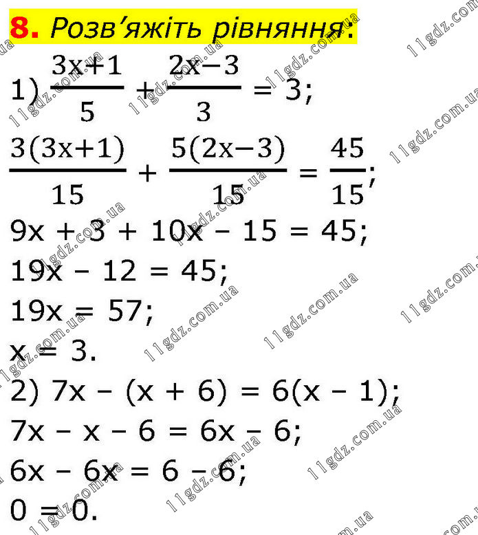 8. Розв’яжіть рівняння: 1) (3х+1)/5 + (2х-3)/3 = 3; (3(3х+1))/15 + (5(2х-3))/15 = 45/15; 9х + 3 + 10х – 15 = 45; 19х – 12 = 45; 19х = 57; х = 3. 2) 7х – (х + 6) = 6(х – 1); 7х – х – 6 = 6х – 6; 6х – 6х = 6 – 6; 0 = 0.