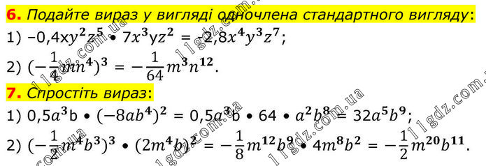 6. Подайте вираз у вигляді одночлена стандартного вигляду: 1) –0,4xy^2 z^5 • 7x^3yz^2 = -2,8x^4 y^3 z^7; 2) 〖(-1/4 mn^4)〗^3 = -1/64 m^3 n^12. 7. Спростіть вираз: 1) 0,5a^3b • 〖(-8ab^4)〗^2 = 0,5a^3b • 64 • a^2 b^8 = 32a^5 b^9; 2) 〖(-1/2 m^4 b^3)〗^3 • 〖(2m^4 b)〗^2 = -1/8 m^12 b^9 • 4m^8 b^2 = -1/2 m^20 b^11.