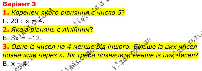 Варіант 3 1. Коренем якого рівняння є число 5? Г. 20 : х = 4. 2. Яке з рівнянь є лінійним? Б. Зх = –12. 3. Одне із чисел на 4 менше від іншого. Більше із цих чисел позначили через х. Як треба позначити менше із цих чисел? B. х – 4.