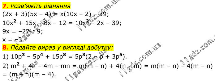 7. Розв’яжіть рівняння (2x + 3)(5x – 4) = x(10x – 2) – 39; 10x2 + 15x – 8x – 12 = 10x2 – 2x – 39; 9x = –27|: 9; x = –3. 8. Подайте вираз у вигляді добутку: 1) 10p3 – 5p4 + 15p8 = 5p3(2 – p + 3p5). 2) m2 + 4n – 4m – mn = m(m – n) + 4(n – m) = m(m – n) – 4(m – n) = (m – n)(m – 4).