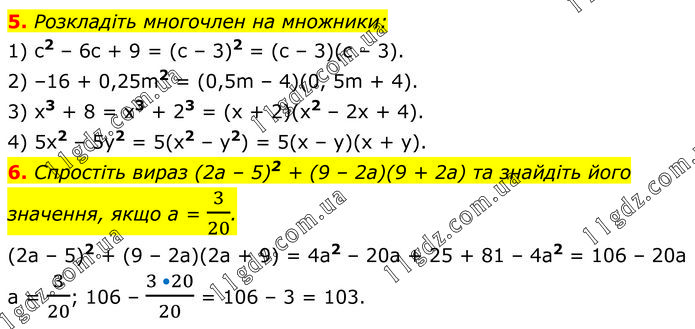 5. Розкладіть многочлен на множники: 1) c2 – 6c + 9 = (c – 3)2 = (c – 3)(c – 3). 2) –16 + 0,25m2 = (0,5m – 4)(0, 5m + 4). 3) x3 + 8 = x3 + 23 = (x + 2)(x2 – 2x + 4). 4) 5x2 – 5y2 = 5(x2 – y2) = 5(x – y)(x + y). 6. Спростіть вираз (2а – 5)2 + (9 – 2а)(9 + 2а) та знайдіть його значення, якщо а = 3/20. (2a – 5)2 + (9 – 2a)(2a + 9) = 4a2 – 20a + 25 + 81 – 4a2 = 106 – 20a a = 3/20; 106 – (3 •20)/20 = 106 – 3 = 103.