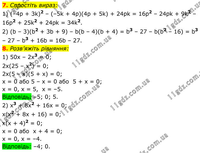 7. Спростіть вираз: 1) (–4p + 3k)2 – (–5k + 4p)(4p + 5k) + 24pk = 16p2 – 24pk + 9k2 – 16p2 + 25k2 + 24pk = 34k2. 2) (b – 3)(b2 + 3b + 9) – b(b – 4)(b + 4) = b3 – 27 – b(b2 – 16) = b3 – 27 – b3 + 16b = 16b – 27. 8. Розв’яжіть рівняння: 1) 50x – 2x3 = 0; 2x(25 – x2) = 0; 2x(5 – x)(5 + x) = 0; x = 0 або 5 – х = 0 або 5 + х = 0; х = 0, х = 5, х = –5. Відповідь: –5; 0; 5. 2) х3 + 8х2 + 16х = 0; х(х2 + 8х + 16) = 0; х(х + 4)2 = 0; х = 0 або х + 4 = 0; х = 0, х = –4. Відповідь: –4; 0.
