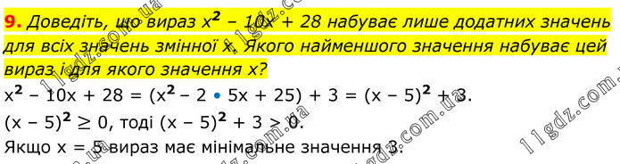 Доведіть, що вираз х2 – 10х + 28 набуває лише додатних значень для всіх значень змінної х. Якого найменшого значення набуває цей вираз і для якого значення х? х2 – 10х + 28 = (х2 – 2 • 5х + 25) + 3 = (х – 5)2 + 3. (х – 5)2 ≥ 0, тоді (х – 5)2 + 3 > 0. Якщо х = 5 вираз має мінімальне значення 3.