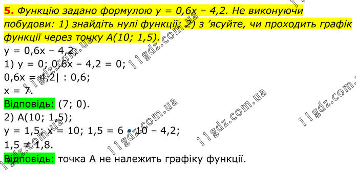 Функцію задано формулою у = 0,6х – 4,2. Не виконуючи побудови: 1) знайдіть нулі функції; 2) з ’ясуйте, чи проходить графік функції через точку А(10; 1,5). y = 0,6x – 4,2; 1) y = 0; 0,6x – 4,2 = 0; 0,6x = 4,2| : 0,6; x = 7. Відповідь: (7; 0). 2) А(10; 1,5); у = 1,5; х = 10; 1,5 = 6 • 10 – 4,2; 1,5 ≠ 1,8. Відповідь: точка А не належить графіку функції.