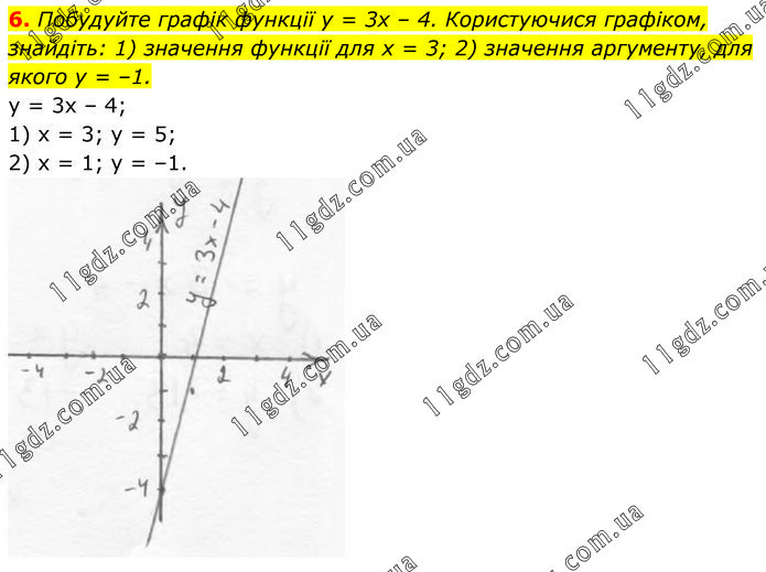Побудуйте графік функції у = 3х – 4. Користуючися графіком, знайдіть: 1) значення функції для х = 3; 2) значення аргументу, для якого у = –1. y = 3x – 4; 1) x = 3; y = 5; 2) x = 1; y = –1.