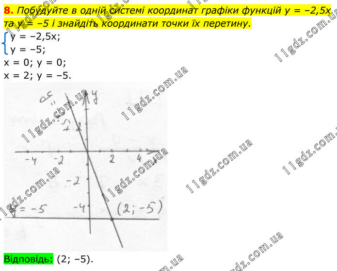 Побудуйте в одній системі координат графіки функцій у = –2,5х та у = –5 і знайдіть координати точки їх перетину. y = –2,5x; y = –5; x = 0; y = 0; x = 2; y = –5. Відповідь: (2; –5).