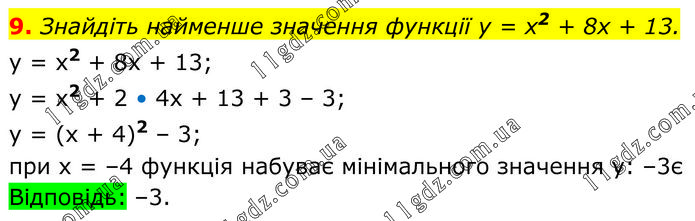 Знайдіть найменше значення функції у = х2 + 8х + 13. y = x2 + 8x + 13; y = x2 + 2 • 4x + 13 + 3 – 3; y = (x + 4)2 – 3; при х = –4 функція набуває мінімального значення у: –3є Відповідь: –3.