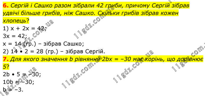 6. Сергій і Сашко разом зібрали 42 гриби, причому Сергій зібрав удвічі більше грибів, ніж Сашко. Скільки грибів зібрав кожен хлопець? 1) х + 2х = 42; 3х = 42; х = 14 (гр.) – зібрав Сашко; 2) 14 • 2 = 28 (гр.) – зібрав Сергій. 7. Для якого значення b рівняння 2bх = –30 має корінь, що дорівнює 5? 2b • 5 = –30; 10b = –30; b = –3.