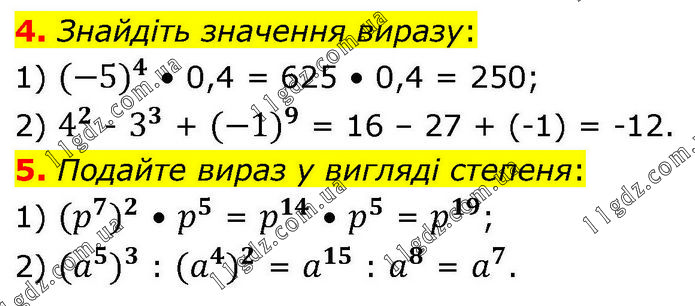 4. Знайдіть значення виразу: 1) 〖(-5)〗^4 • 0,4 = 625 • 0,4 = 250; 2) 4^2 - 3^3 + 〖(-1)〗^9 = 16 – 27 + (-1) = -12. 5. Подайте вираз у вигляді степеня: 1) 〖(p^7)〗^2 • p^5 = p^14 • p^5 = p^19; 2) 〖(a^5)〗^3 : 〖(a^4)〗^2 = a^15 : a^8 = a^7.
