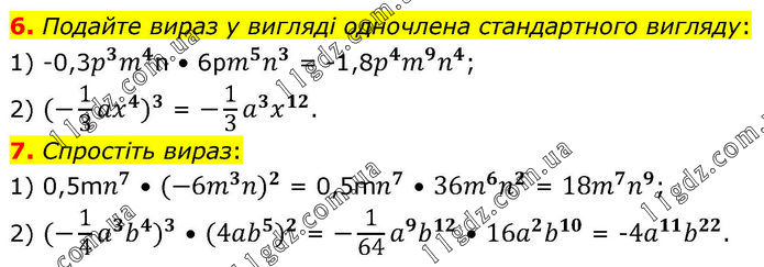 6. Подайте вираз у вигляді одночлена стандартного вигляду: 1) -0,3p^3 m^4n • 6pm^5 n^3 = -1,8p^4 m^9 n^4; 2) 〖(-1/3 ax^4)〗^3 = -1/3 a^3 x^12. 7. Спростіть вираз: 1) 0,5mn^7 • 〖(-6m^3 n)〗^2 = 0,5mn^7 • 〖36m^6 n〗^2 = 〖18m^7 n〗^9; 2) 〖(-1/4 a^3 b^4)〗^3 • 〖(4ab^5)〗^2 = 〖-1/64 a^9 b〗^12 • 〖16a^2 b〗^10 = -〖4a^11 b〗^22.