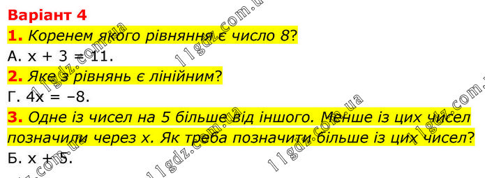 Варіант 4 1. Коренем якого рівняння є число 8? A. х + 3 = 11. 2. Яке з рівнянь є лінійним? Г. 4х = –8. 3. Одне із чисел на 5 більше від іншого. Менше із цих чисел позначили через х. Як треба позначити більше із цих чисел? Б. х + 5.
