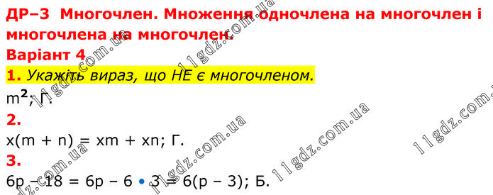 ДР–3 Многочлен. Множення одночлена на многочлен і многочлена на многочлен. Варіант 4 1. Укажіть вираз, що НЕ є многочленом. m2; Г. 2. x(m + n) = xm + xn; Г. 3. 6p – 18 = 6p – 6 • 3 = 6(p – 3); Б.