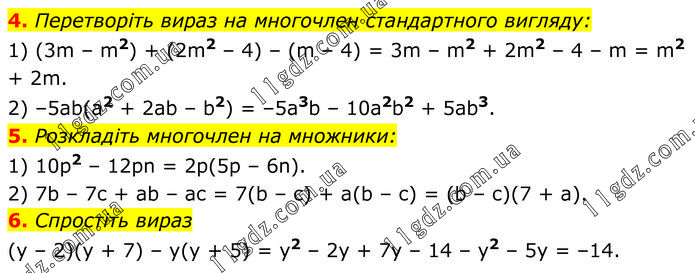 4. Перетворіть вираз на многочлен стандартного вигляду: 1) (3m – m2) + (2m2 – 4) – (m – 4) = 3m – m2 + 2m2 – 4 – m = m2 + 2m. 2) –5ab(a2 + 2ab – b2) = –5a3b – 10a2b2 + 5ab3. 5. Розкладіть многочлен на множники: 1) 10p2 – 12pn = 2p(5p – 6n). 2) 7b – 7c + ab – ac = 7(b – c) + a(b – c) = (b – c)(7 + a). 6. Спростіть вираз (y – 2)(y + 7) – y(y + 5) = y2 – 2y + 7y – 14 – y2 – 5y = –14.