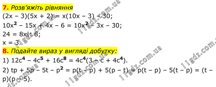 7. Розв’яжіть рівняння (2x – 3)(5x + 2) = x(10x – 3) – 30; 10x2 – 15x + 4x – 6 = 10x2 – 3x – 30; 24 = 8x|: 8; x = 3. 8. Подайте вираз у вигляді добутку: 1) 12c4 – 4c5 + 16c8 = 4c4(3 – c + 4c4). 2) tp + 5p – 5t – p2 = p(t – p) + 5(p – t) = p(t – p) – 5(t – p) = (t – p)(p – 5).