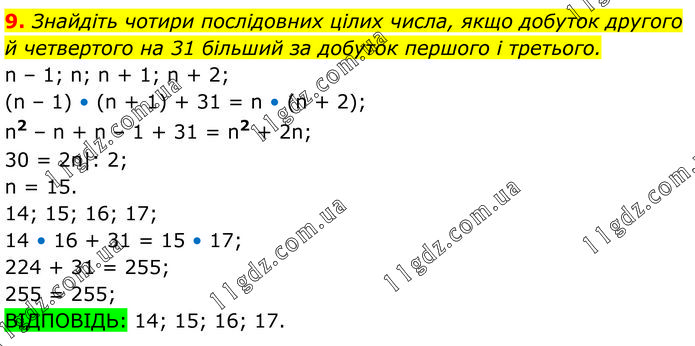9. Знайдіть чотири послідовних цілих числа, якщо добуток другого й четвертого на 31 більший за добуток першого і третього. n – 1; n; n + 1; n + 2; (n – 1) • (n + 1) + 31 = n • (n + 2); n2 – n + n – 1 + 31 = n2 + 2n; 30 = 2n|: 2; n = 15. 14; 15; 16; 17; 14 • 16 + 31 = 15 • 17; 224 + 31 = 255; 255 = 255; ВІДПОВІДЬ: 14; 15; 16; 17.