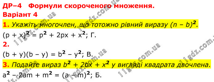 ДР–4 Формули скороченого множення. Варіант 4 1. Укажіть многочлен, що тотожно рівний виразу (n – b)2. (p + x)2 = p2 + 2px + x2; Г. 2. (b + y)(b – y) = b2 – y2; B. 3. Подайте вираз b2 + 2bх + х2 у вигляді квадрата двочлена. a2 – 2am + m2 = (a – m)2; Б.