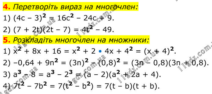 4. Перетворіть вираз на многочлен: 1) (4c – 3)2 = 16c2 – 24c + 9. 2) (7 + 2t)(2t – 7) = 4t2 – 49. 5. Розкладіть многочлен на множники: 1) x2 + 8x + 16 = x2 + 2 • 4x + 42 = (x + 4)2. 2) –0,64 + 9n2 = (3n)2 – (0,8)2 = (3n – 0,8)(3n + 0,8). 3) a3 – 8 = a3 – 23 = (a – 2)(a2 + 2a + 4). 4) 7t2 – 7b2 = 7(t2 – b2) = 7(t – b)(t + b).