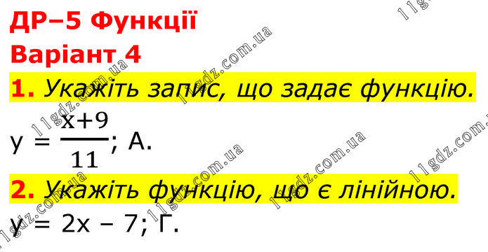 ДР–5 Функції Варіант 4 1. Укажіть запис, що задає функцію. y = (x+9)/11; А. 2. Укажіть функцію, що є лінійною. y = 2x – 7; Г.