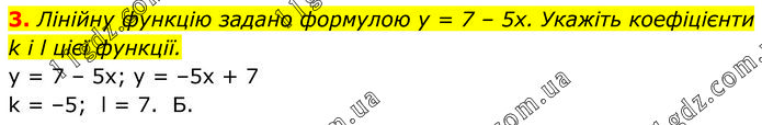 Лінійну функцію задано формулою у = 7 – 5х. Укажіть коефіцієнти k і l цієї функції. y = 7 – 5x; y = –5x + 7 k = –5; l = 7. Б.