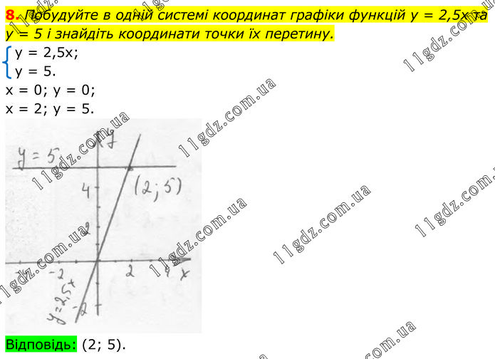 Побудуйте в одній системі координат графіки функцій у = 2,5х та у = 5 і знайдіть координати точки їх перетину. y = 2,5x; y = 5. x = 0; y = 0; x = 2; y = 5. Відповідь: (2; 5).
