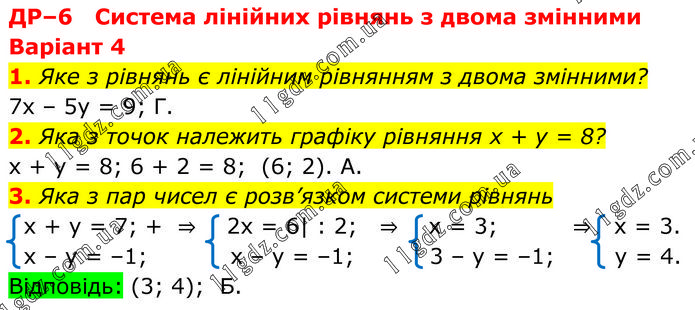 ДР–6 Система лінійних рівнянь з двома змінними Варіант 4 1. Яке з рівнянь є лінійним рівнянням з двома змінними? 7x – 5y = 9; Г. 2. Яка з точок належить графіку рівняння х + у = 8? x + y = 8; 6 + 2 = 8; (6; 2). A. 3. Яка з пар чисел є розв’язком системи рівнянь