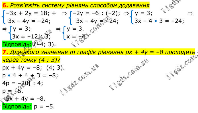 Для якого значення m графік рівняння pх + 4у = –8 проходить через точку (4 ; 3)? px + 4y = –8; (4; 3). p • 4 + 4 + 3 = –8; 4p = –20| : 4; p = –5. –5x + 4y = –8. Відповідь: p = –5.