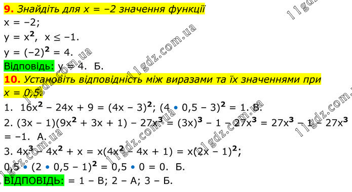 9. Знайдіть для х = –2 значення функції x = –2; y = x2, x ≤ –1. y = (–2)2 = 4. Відповідь: y = 4. Б. 10. Установіть відповідність між виразами та їх значеннями при х = 0,5. 1. 16x2 – 24x + 9 = (4x – 3)2; (4 • 0,5 – 3)2 = 1. B. 2. (3x – 1)(9x2 + 3x + 1) – 27x3 = (3x)3 – 1 – 27x3 = 27x3 – 1 – 27x3 = –1. A. 3. 4x3 – 4x2 + x = x(4x2 – 4x + 1) = x(2x – 1)2; 0,5 • (2 • 0,5 – 1)2 = 0,5 • 0 = 0. Б. ВІДПОВІДЬ: = 1 – В; 2 – А; 3 – Б.