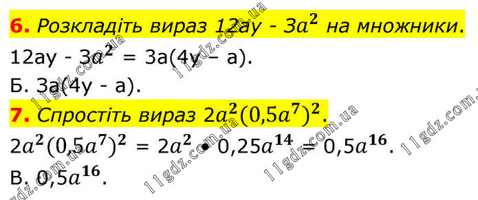 6. Розкладіть вираз 12ау - Зa^2 на множники. 12ау - Зa^2 = 3a(4y – a). Б. За(4у - а). 7. Спростіть вираз 2a^2 〖(0,5a^7)〗^2. 2a^2 〖(0,5a^7)〗^2 = 2a^2 • 0,25a^14 = 0,5a^16. В. 0,5a^16.