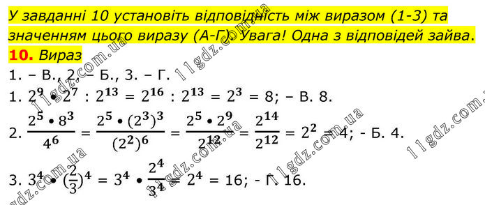 У завданні 10 установіть відповідність між виразом (1-3) та значенням цього виразу (А-Г). Увага! Одна з відповідей зайва. 10. Вираз 1. – В., 2. – Б., 3. – Г. 1. 2^9 • 2^7 : 2^13 = 2^16 : 2^13 = 2^3 = 8; – В. 8. 2. (2^5 • 8^3)/4^6 = (2^5 • 〖(2^3)〗^3)/〖(2^2)〗^6 = (2^5 • 2^9)/2^12 = 2^14/2^12 = 2^2 = 4; - Б. 4. 3. 3^4 • 〖(2/3)〗^4 = 3^4 • 2^4/3^4 = 2^4 = 16; - Г. 16.