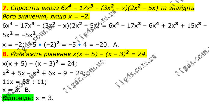 7. Спростіть вираз 6х4 – 17х3 – (Зх2 – х)(2х2 – 5х) та знайдіть його значення, якщо х = –2. 6x4 – 17x3 – (3x2 – x)(2x2 – 5x) = 6x4 – 17x3 – 6x4 + 2x3 + 15x3 – 5x2 = –5x2. x = –2; –5 • (–2)2 = –5 • 4 = –20. A. 8. Розв’яжіть рівняння х(х + 5) – (х – З)2 = 24. x(x + 5) – (x – 3)2 = 24; x2 + 5x – x2 + 6x – 9 = 24; 11x = 33|: 11; x = 3. B. Відповідь: x = 3.