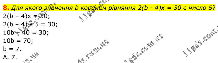 8. Для якого значення b коренем рівняння 2(b - 4)х = 30 є число 5? 2(b – 4)x = 30; 2(b – 4) • 5 = 30; 10b – 40 = 30; 10b = 70; b = 7. А. 7.