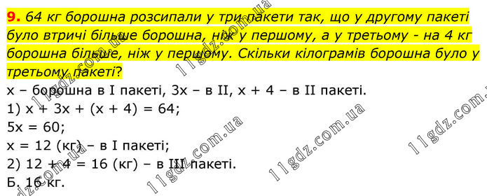 9. 64 кг борошна розсипали у три пакети так, що у другому пакеті було втричі більше борошна, ніж у першому, а у третьому - на 4 кг борошна більше, ніж у першому. Скільки кілограмів борошна було у третьому пакеті? х – борошна в І пакеті, 3х – в ІІ, х + 4 – в ІІ пакеті. 1) х + 3х + (х + 4) = 64; 5х = 60; х = 12 (кг) – в І пакеті; 2) 12 + 4 = 16 (кг) – в ІІІ пакеті. Б. 16 кг.
